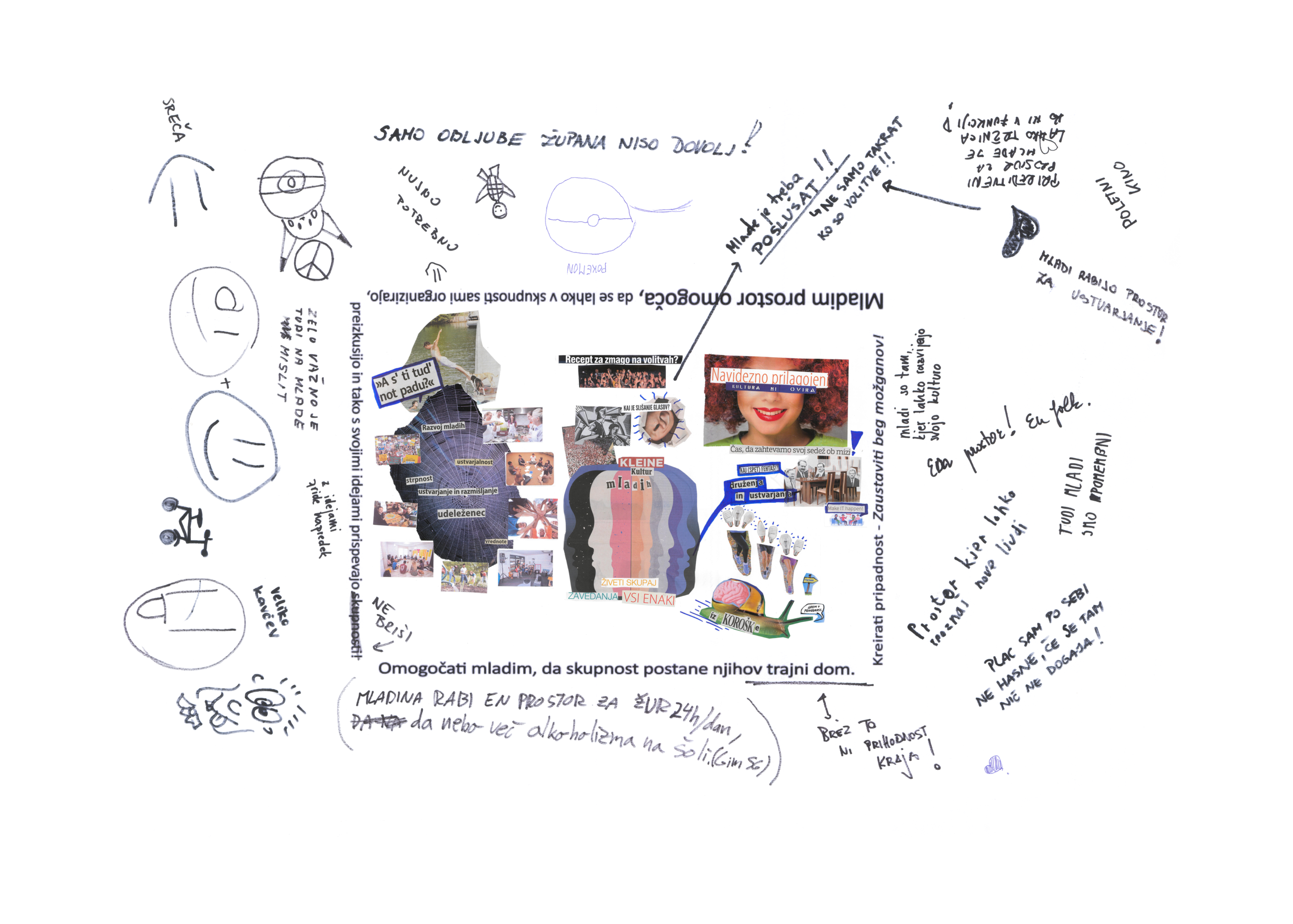 Kakšne pravzaprav so potrebe mladih? Mladi se morajo v teh letih družiti, povezovati, graditi odnose. Pomembno je, da imajo podporo v svoji skupnosti oziroma v občini, iz katere prihajajo. Torej, ključni vprašanji sta, kaj lahko mladim njihovo lokalno okolje omogoči in kakšne priložnosti za osebnostno rast jim nudi. Člani društva ugotavljamo, da sta odgovora na ti dve vprašanji pomanjkljiva. Iz teh razlogov smo se povezali s kulturnim društvom raum AU in projekt izvedli v treh fazah na način koncepta Arte Utile, ki deluje po načelih akribičnega raziskovalnega dela, kjer se tematizirajo konkretno opažene težave. Prva faza AU procesa je bazirala na razmisleku o problematiki mladinskega prostora v lokalnem okolju. Na podlagi statističnih podatkov iz naše regije smo izdelali dva plakata v tehniki kolaž. Oba izpostavljata družbeno kritičen pogled na prihodnost mladih v naši občini in prikazujeta, kako bi mladi mladinski prostor lahko uporabili in kakšne aktivnosti bi v njem lahko izvajali. Druga faza je temeljila na interakcijski delavnici na prostem, kjer smo mimoidoče povabili k reflektiranju problematike mladinskih prostorov in jih tudi povabili, da zapišejo svojo mnenje na izdelane kolaže. Tretja faza AU procesa pa je temeljila na predvolilnem diskusijskem večeru, kamor smo povabili naslednje goste: Dušana Krebla, nekdanjega župana Občine Mežica, Marka Mazeja, župana Občine Mežica, Aleksandra Praperja, predsednika Komisije za mlade in šport v Mežici, Boruta Bončino, urbanista, Ireno Pirtovšek Mazej, protikandidatko na lokalnih volitvah in Franja Hercoga, protikandidata na lokalnih volitvah.