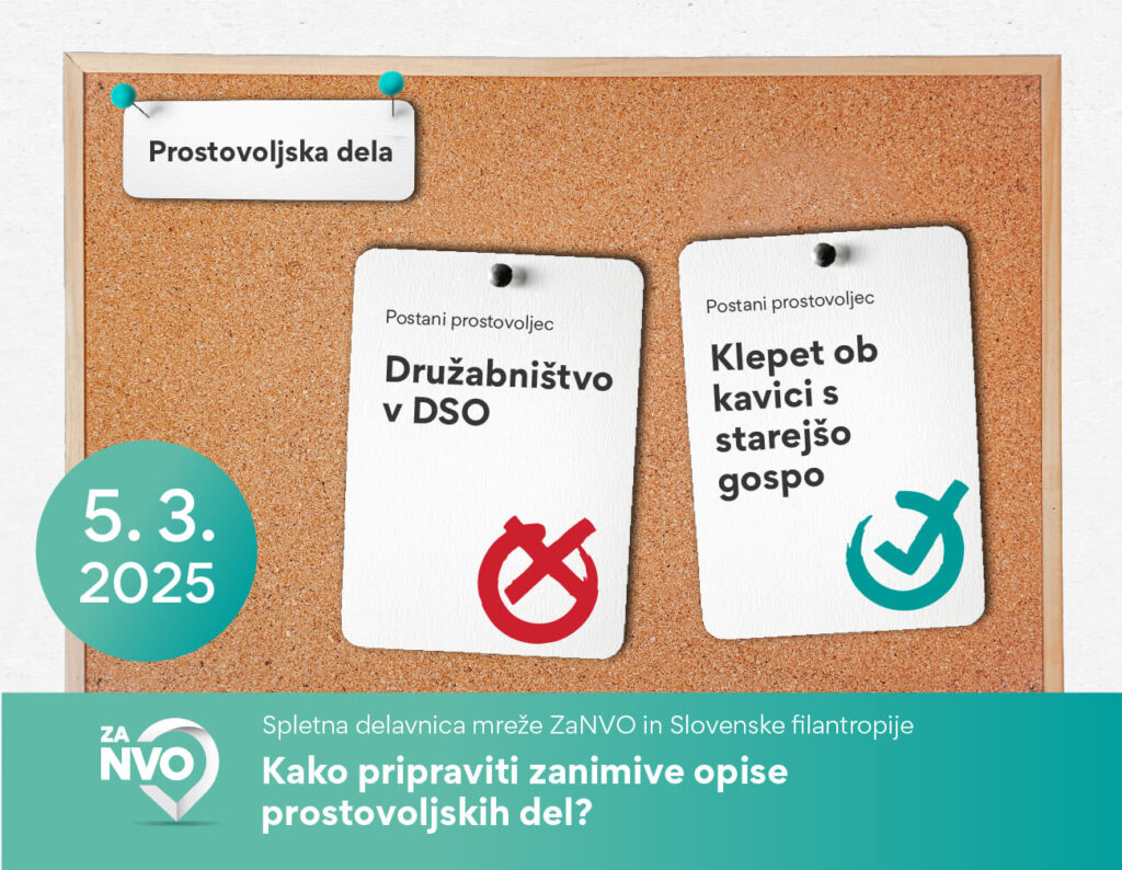 Je prostovoljcev resnično vse manj ali jih zgolj ne znamo privabiti? V poplavi objav mora opis vašega prostovoljskega dela izstopati ter hkrati razumljivo komunicirati, kaj delo obsega. Kdaj: sreda, 5. 3. 2025, od 17.00 do 18.00Kje: preko spletaPrijava: Prijavni obrazecRok za prijavo: 3. 3. 2025 Z vami bo Jaša Rajšek, sodelavec Slovenske filantropije za informiranje in promocijo ter moderator […]