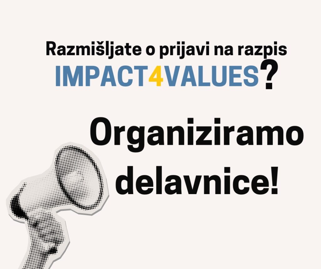 V okviru programa Impact4Values 2.0 je objavljen nov Javni razpis za projekte lokalnih (grassroots) nevladnih organizacij za zaščito in promocijo vrednot EU. Preverite podrobnosti in izkoristite priložnost. Cilj razpisa Podpreti lokalne nevladne organizacije pri njihovem prizadevanju za zaščito in promocijo vrednot EU ter zagotoviti podporo za njihov razvoj. Upravičenci Razpis je namenjen nevladnim organizacijam v Sloveniji, katerih povprečni […]